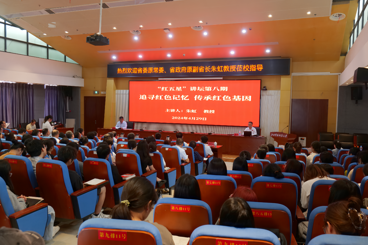 4月29日上午,南昌大学教授、博士生导师、江西省委原常委、省政府原副省长朱虹受邀做客学校第八期“红五星”讲坛。江西科技师范大学党委书记裴鸿卫主持。江西科技师范大学校长左和平,校党委副书记刘国云等领导出席。