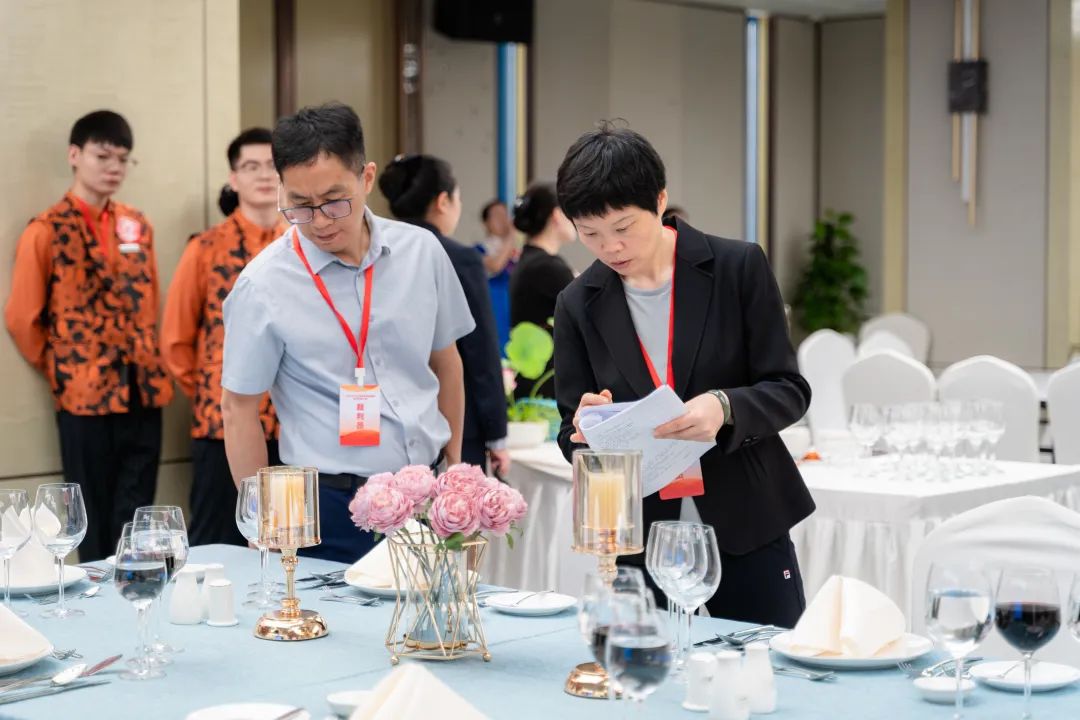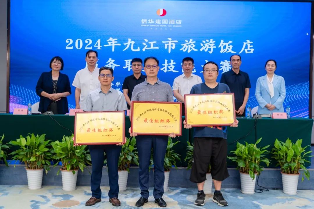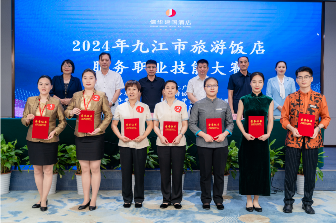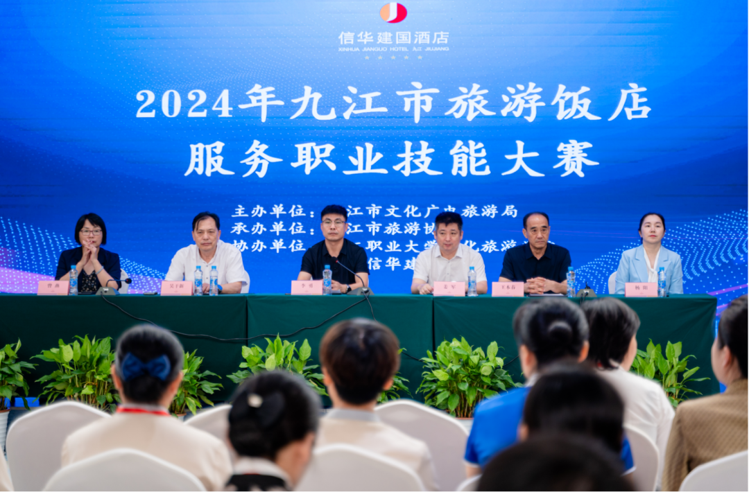 2024年7月9日,九江市旅游饭店服务职业技能大赛在九江信华建国酒店举行。来自九江市三星级以上酒店的32名服务员进入了决赛,分别参加前厅服务、中式铺床、中餐宴会摆台、西餐宴会摆台4个赛项的比赛。全体参赛选手勇敢地站在各自的赛项场地,亮出自我,挑战自我,赛出了水平,赛出了风格,表现出了不甘居人后,力争上游的优秀品质。